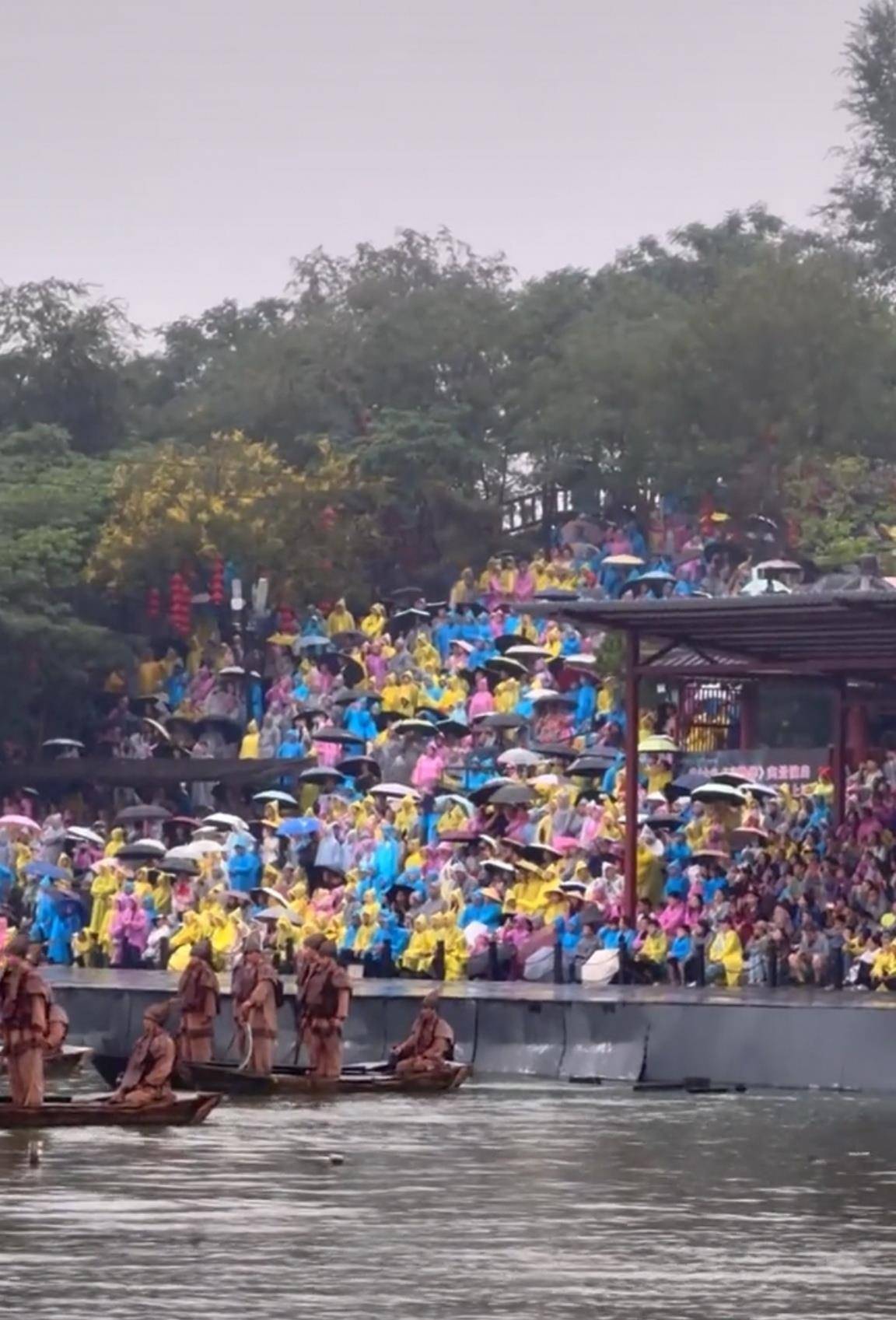 2日上午,该园工作人员告诉记者,游客进园之后,在门口可以免费领取雨衣,正常是穿不破的,这个雨衣没有打LOGO,“太多了,现在印不上。”问及为何想到免费发放,该工作人员表示:“下雨为顾客发放雨衣,提供必要的帮助是应该的。”在2日的景区直播中,极目新闻记者注意到,观众台上不少游客都穿着景区发放的雨衣观看表演。